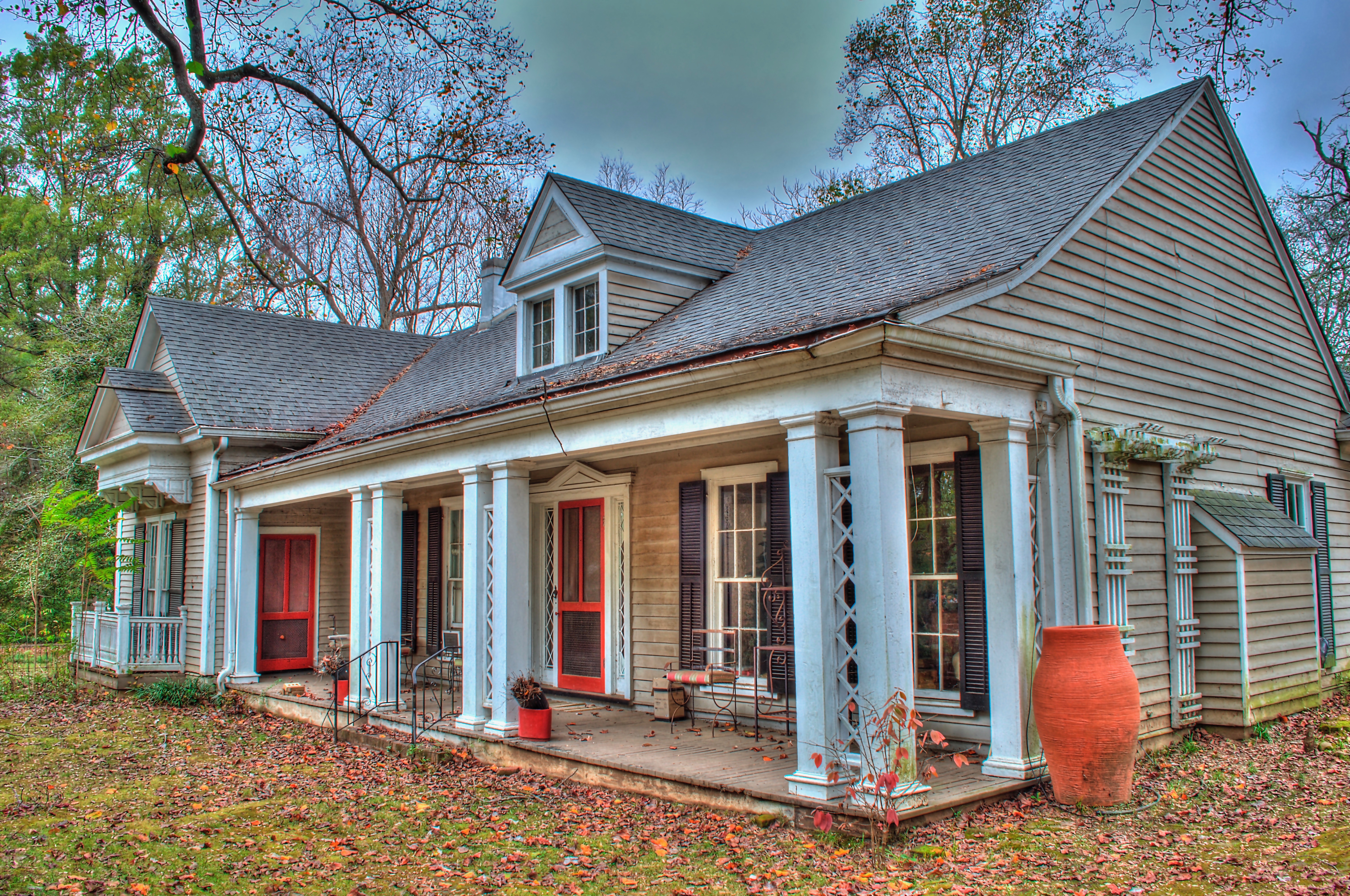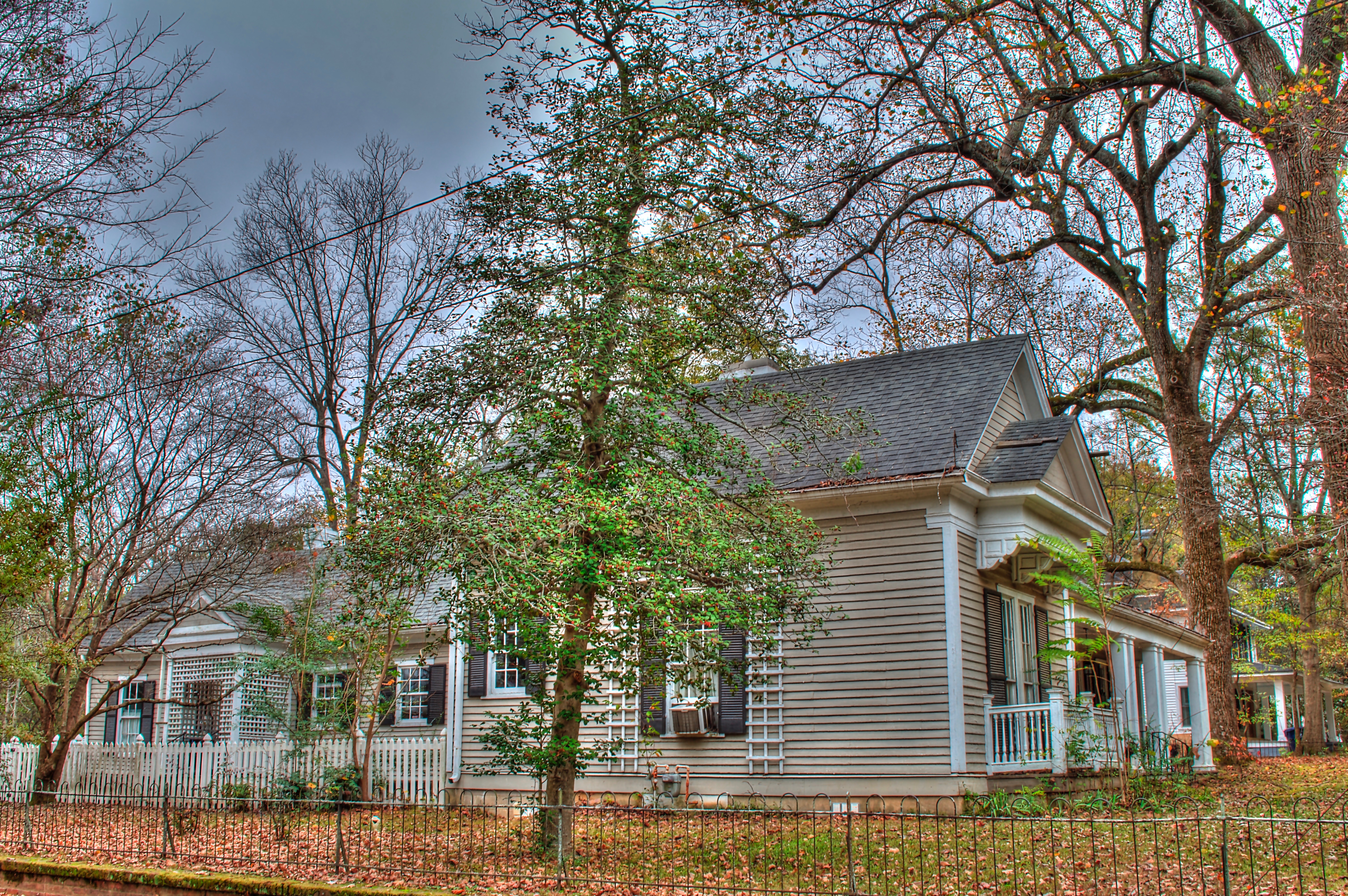 The Randolph-McGuirk-Booker House, also known as “Alicia”, is a Greek Revival home, with later Italianate and Victorian additions, which hides a much older log cabin underneath which could be one of the oldest surviving homes in Holly Springs. The exact origins of the house remain unknown, as the earliest deeds to the property have been lost. However, according to local legend and tradition, the original dogtrot log cabin here was built in about 1835 by Jack Randolph, the brother of town founder William S. Randolph. The Randolphs first moved to Holly Springs in early 1835, making it likely that the log cabin could date back to the earliest days of white settlement in Holly Springs. In addition, the immediate neighborhood contains several other examples of the early dogtrot log cabin (including Cuffawa (1838), Sims-Jones House (Box Hill) (c.1840), Blake-Mullins-Callicutt House (The Terrace) (1842) and the Governor Matthews House), making it likely this area that would become Chulahoma Avenue was an early residential development in Holly Springs.